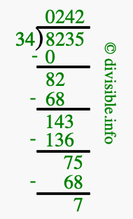 The image displays 242 at the top, which is the quotient, and 7 at the bottom, which is the remainder. Therefore, the answer to 8235 divided by 34 (8235 ÷ 34) using long division is 242 remainder 7, or simply 242 R 7.