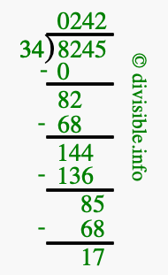 The image displays 242 at the top, which is the quotient, and 17 at the bottom, which is the remainder. Therefore, the answer to 8245 divided by 34 (8245 ÷ 34) using long division is 242 remainder 17, or simply 242 R 17.