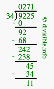 The image displays 271 at the top, which is the quotient, and 11 at the bottom, which is the remainder. Therefore, the answer to 9225 divided by 34 (9225 ÷ 34) using long division is 271 remainder 11, or simply 271 R 11.