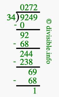 The image displays 272 at the top, which is the quotient, and 1 at the bottom, which is the remainder. Therefore, the answer to 9249 divided by 34 (9249 ÷ 34) using long division is 272 remainder 1, or simply 272 R 1.