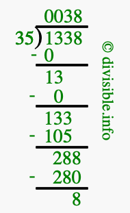 Here we will show you an image that illustrates how to calculate 1338 divided by 35 using long division. We will also give you the answer to 1338 divided by 35 (1338 ÷ 35) as a fraction and as a decimal.