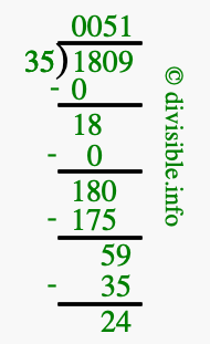 The image displays 51 at the top, which is the quotient, and 24 at the bottom, which is the remainder. Therefore, the answer to 1809 divided by 35 (1809 ÷ 35) using long division is 51 remainder 24, or simply 51 R 24.