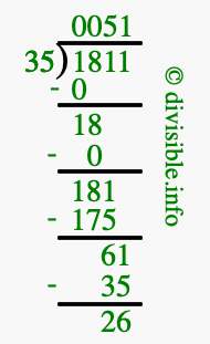 The image displays 51 at the top, which is the quotient, and 26 at the bottom, which is the remainder. Therefore, the answer to 1811 divided by 35 (1811 ÷ 35) using long division is 51 remainder 26, or simply 51 R 26.
