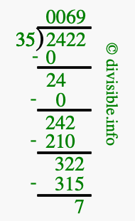The image displays 69 at the top, which is the quotient, and 7 at the bottom, which is the remainder. Therefore, the answer to 2422 divided by 35 (2422 ÷ 35) using long division is 69 remainder 7, or simply 69 R 7.