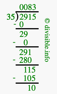 The image displays 83 at the top, which is the quotient, and 10 at the bottom, which is the remainder. Therefore, the answer to 2915 divided by 35 (2915 ÷ 35) using long division is 83 remainder 10, or simply 83 R 10.