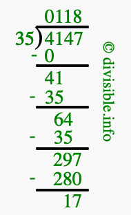 The image displays 118 at the top, which is the quotient, and 17 at the bottom, which is the remainder. Therefore, the answer to 4147 divided by 35 (4147 ÷ 35) using long division is 118 remainder 17, or simply 118 R 17.
