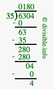 The image displays 180 at the top, which is the quotient, and 4 at the bottom, which is the remainder. Therefore, the answer to 6304 divided by 35 (6304 ÷ 35) using long division is 180 remainder 4, or simply 180 R 4.
