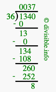 Here we will show you an image that illustrates how to calculate 1340 divided by 36 using long division. We will also give you the answer to 1340 divided by 36 (1340 ÷ 36) as a fraction and as a decimal.