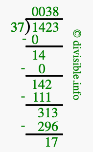 The image displays 38 at the top, which is the quotient, and 17 at the bottom, which is the remainder. Therefore, the answer to 1423 divided by 37 (1423 ÷ 37) using long division is 38 remainder 17, or simply 38 R 17.