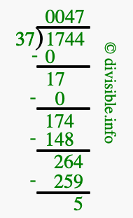 The image displays 47 at the top, which is the quotient, and 5 at the bottom, which is the remainder. Therefore, the answer to 1744 divided by 37 (1744 ÷ 37) using long division is 47 remainder 5, or simply 47 R 5.