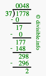 The image displays 48 at the top, which is the quotient, and 2 at the bottom, which is the remainder. Therefore, the answer to 1778 divided by 37 (1778 ÷ 37) using long division is 48 remainder 2, or simply 48 R 2.