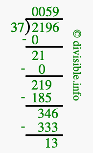 The image displays 59 at the top, which is the quotient, and 13 at the bottom, which is the remainder. Therefore, the answer to 2196 divided by 37 (2196 ÷ 37) using long division is 59 remainder 13, or simply 59 R 13.