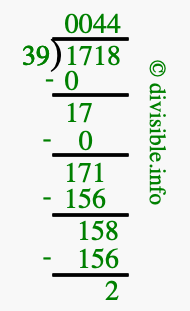 The illustration below shows you how to calculate 1718 divided by 39 using long division. As you can see, the dividend value of 1718 is located to the right of the "⟌" and the divisor value of 39 is located to the left of the "⟌".