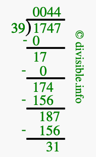 Here we will show you an image that illustrates how to calculate 1747 divided by 39 using long division. We will also give you the answer to 1747 divided by 39 (1747 ÷ 39) as a fraction and as a decimal.