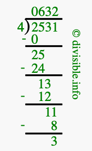 Here we will show you an image that illustrates how to calculate 2531 divided by 4 using long division. We will also give you the answer to 2531 divided by 4 (2531 ÷ 4) as a fraction and as a decimal.