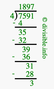 The image displays 1897 at the top, which is the quotient, and 3 at the bottom, which is the remainder. Therefore, the answer to 7591 divided by 4 (7591 ÷ 4) using long division is 1897 remainder 3, or simply 1897 R 3.