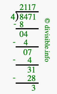 The image displays 2117 at the top, which is the quotient, and 3 at the bottom, which is the remainder. Therefore, the answer to 8471 divided by 4 (8471 ÷ 4) using long division is 2117 remainder 3, or simply 2117 R 3.