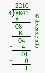 The image displays 2210 at the top, which is the quotient, and 1 at the bottom, which is the remainder. Therefore, the answer to 8841 divided by 4 (8841 ÷ 4) using long division is 2210 remainder 1, or simply 2210 R 1.
