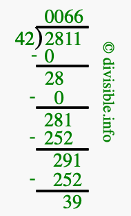 The image displays 66 at the top, which is the quotient, and 39 at the bottom, which is the remainder. Therefore, the answer to 2811 divided by 42 (2811 ÷ 42) using long division is 66 remainder 39, or simply 66 R 39.