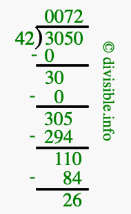 The image displays 72 at the top, which is the quotient, and 26 at the bottom, which is the remainder. Therefore, the answer to 3050 divided by 42 (3050 ÷ 42) using long division is 72 remainder 26, or simply 72 R 26.