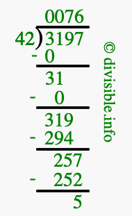 The image displays 76 at the top, which is the quotient, and 5 at the bottom, which is the remainder. Therefore, the answer to 3197 divided by 42 (3197 ÷ 42) using long division is 76 remainder 5, or simply 76 R 5.