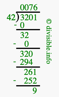 The image displays 76 at the top, which is the quotient, and 9 at the bottom, which is the remainder. Therefore, the answer to 3201 divided by 42 (3201 ÷ 42) using long division is 76 remainder 9, or simply 76 R 9.