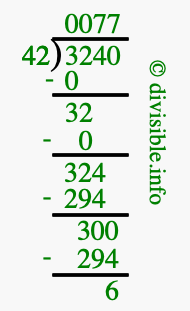 The image displays 77 at the top, which is the quotient, and 6 at the bottom, which is the remainder. Therefore, the answer to 3240 divided by 42 (3240 ÷ 42) using long division is 77 remainder 6, or simply 77 R 6.