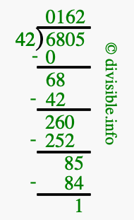 Here we will show you an image that illustrates how to calculate 6805 divided by 42 using long division. We will also give you the answer to 6805 divided by 42 (6805 ÷ 42) as a fraction and as a decimal.