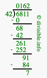Here we will show you an image that illustrates how to calculate 6811 divided by 42 using long division. We will also give you the answer to 6811 divided by 42 (6811 ÷ 42) as a fraction and as a decimal.