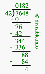 The image displays 182 at the top, which is the quotient, and 4 at the bottom, which is the remainder. Therefore, the answer to 7648 divided by 42 (7648 ÷ 42) using long division is 182 remainder 4, or simply 182 R 4.