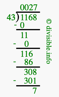 The image displays 27 at the top, which is the quotient, and 7 at the bottom, which is the remainder. Therefore, the answer to 1168 divided by 43 (1168 ÷ 43) using long division is 27 remainder 7, or simply 27 R 7.