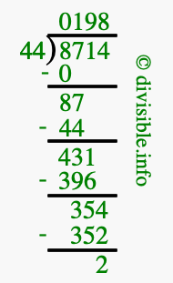 The image displays 198 at the top, which is the quotient, and 2 at the bottom, which is the remainder. Therefore, the answer to 8714 divided by 44 (8714 ÷ 44) using long division is 198 remainder 2, or simply 198 R 2.