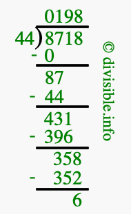 The illustration below shows you how to calculate 8718 divided by 44 using long division. As you can see, the dividend value of 8718 is located to the right of the "⟌" and the divisor value of 44 is located to the left of the "⟌".