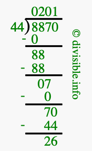 The image displays 201 at the top, which is the quotient, and 26 at the bottom, which is the remainder. Therefore, the answer to 8870 divided by 44 (8870 ÷ 44) using long division is 201 remainder 26, or simply 201 R 26.