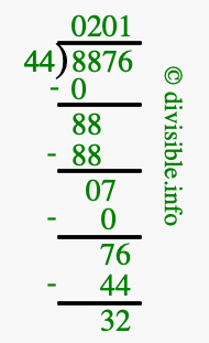 The image displays 201 at the top, which is the quotient, and 32 at the bottom, which is the remainder. Therefore, the answer to 8876 divided by 44 (8876 ÷ 44) using long division is 201 remainder 32, or simply 201 R 32.