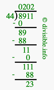 The image displays 202 at the top, which is the quotient, and 23 at the bottom, which is the remainder. Therefore, the answer to 8911 divided by 44 (8911 ÷ 44) using long division is 202 remainder 23, or simply 202 R 23.