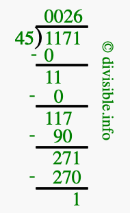 The image displays 26 at the top, which is the quotient, and 1 at the bottom, which is the remainder. Therefore, the answer to 1171 divided by 45 (1171 ÷ 45) using long division is 26 remainder 1, or simply 26 R 1.