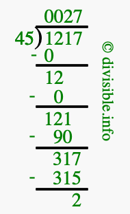 The image displays 27 at the top, which is the quotient, and 2 at the bottom, which is the remainder. Therefore, the answer to 1217 divided by 45 (1217 ÷ 45) using long division is 27 remainder 2, or simply 27 R 2.