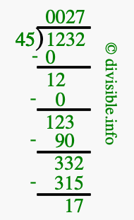 The image displays 27 at the top, which is the quotient, and 17 at the bottom, which is the remainder. Therefore, the answer to 1232 divided by 45 (1232 ÷ 45) using long division is 27 remainder 17, or simply 27 R 17.