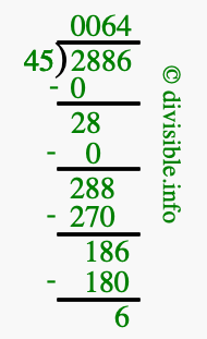 The illustration below shows you how to calculate 2886 divided by 45 using long division. As you can see, the dividend value of 2886 is located to the right of the "⟌" and the divisor value of 45 is located to the left of the "⟌".