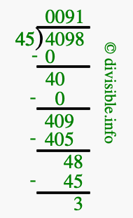 The image displays 91 at the top, which is the quotient, and 3 at the bottom, which is the remainder. Therefore, the answer to 4098 divided by 45 (4098 ÷ 45) using long division is 91 remainder 3, or simply 91 R 3.