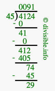 The image displays 91 at the top, which is the quotient, and 29 at the bottom, which is the remainder. Therefore, the answer to 4124 divided by 45 (4124 ÷ 45) using long division is 91 remainder 29, or simply 91 R 29.