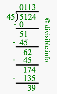 The image displays 113 at the top, which is the quotient, and 39 at the bottom, which is the remainder. Therefore, the answer to 5124 divided by 45 (5124 ÷ 45) using long division is 113 remainder 39, or simply 113 R 39.