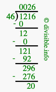 The image displays 26 at the top, which is the quotient, and 20 at the bottom, which is the remainder. Therefore, the answer to 1216 divided by 46 (1216 ÷ 46) using long division is 26 remainder 20, or simply 26 R 20.