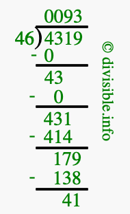 Here we will show you an image that illustrates how to calculate 4319 divided by 46 using long division. We will also give you the answer to 4319 divided by 46 (4319 ÷ 46) as a fraction and as a decimal.