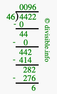 Here we will show you an image that illustrates how to calculate 4422 divided by 46 using long division. We will also give you the answer to 4422 divided by 46 (4422 ÷ 46) as a fraction and as a decimal.