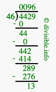 Here we will show you an image that illustrates how to calculate 4429 divided by 46 using long division. We will also give you the answer to 4429 divided by 46 (4429 ÷ 46) as a fraction and as a decimal.