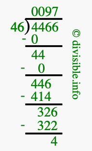 Here we will show you an image that illustrates how to calculate 4466 divided by 46 using long division. We will also give you the answer to 4466 divided by 46 (4466 ÷ 46) as a fraction and as a decimal.