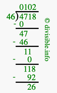 The image displays 102 at the top, which is the quotient, and 26 at the bottom, which is the remainder. Therefore, the answer to 4718 divided by 46 (4718 ÷ 46) using long division is 102 remainder 26, or simply 102 R 26.