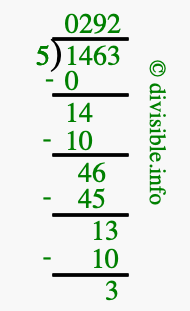 The image displays 292 at the top, which is the quotient, and 3 at the bottom, which is the remainder. Therefore, the answer to 1463 divided by 5 (1463 ÷ 5) using long division is 292 remainder 3, or simply 292 R 3.